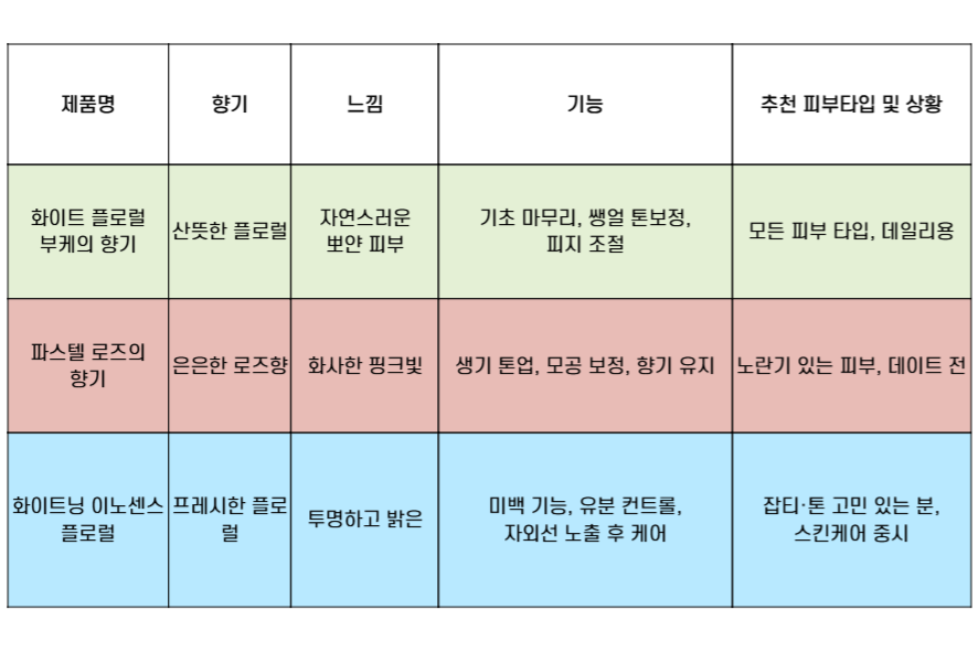각 제품마다 향기와 기능, 사용감이 미묘하게 다르기 때문에 본인의 피부 타입과 취향에 맞게 선택하는 것이 중요합니다.