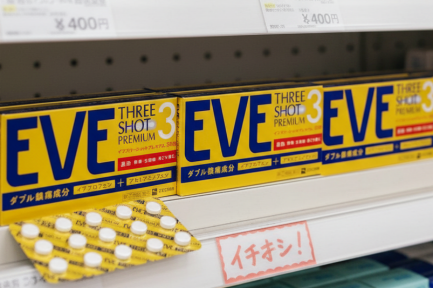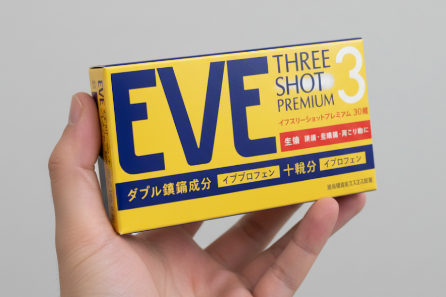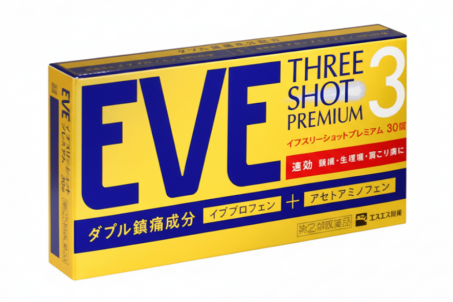 그중에서도 이브 쓰리샷 프리미엄(イブ・スリーショット プレミアム)은 기존 이브 제품보다 더 빠르고 강력하게 통증을 완화해주는 업그레이드 버전으로, 다음과 같은 3가지 주요 성분이 함유되어 있습니다.