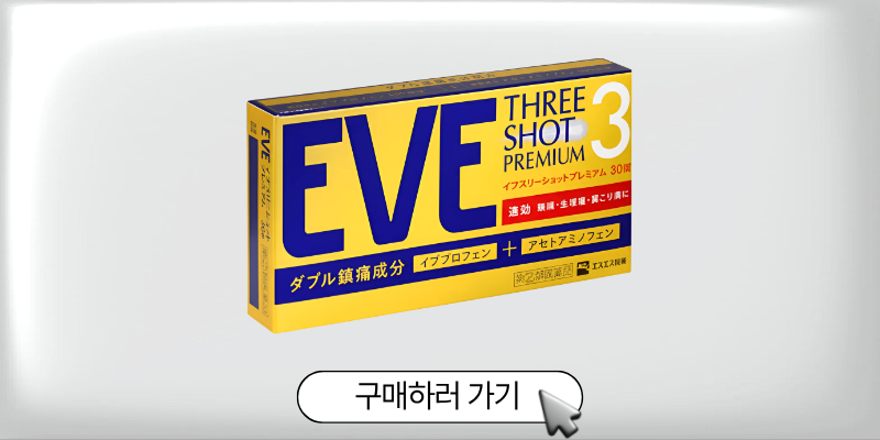 오늘 소개할 제품은 일본에서 생리통 약으로 특히 유명한 ‘이브(EVE)’ 시리즈 중에서도 가장 최신 프리미엄 버전인 '이브 쓰리샷 프리미엄’입니다.